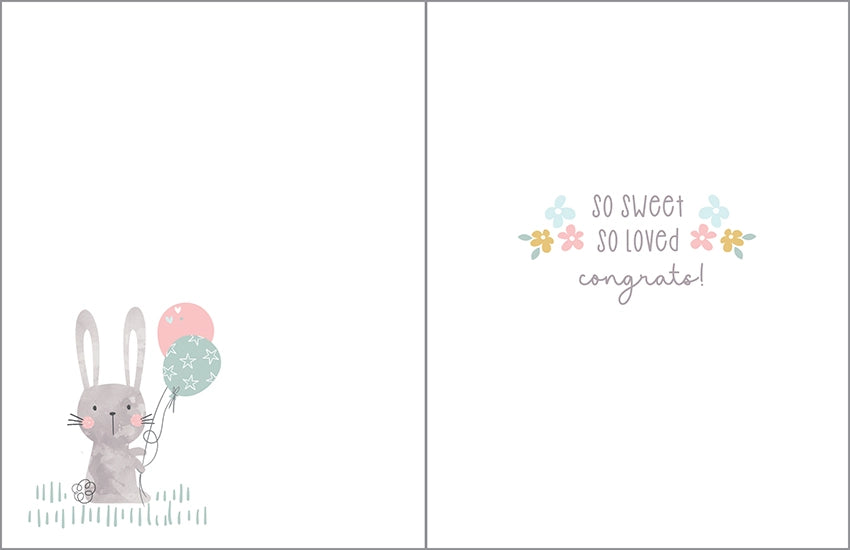 Greeting card with Envelope Hello little baby girl So sweet so loved Congrats! Art by Angela Nickeas, Pink Light Studio Embellished with gold foil Folded size: 4.25" x 5.5" (A2). Proudly made in the U.S.A.