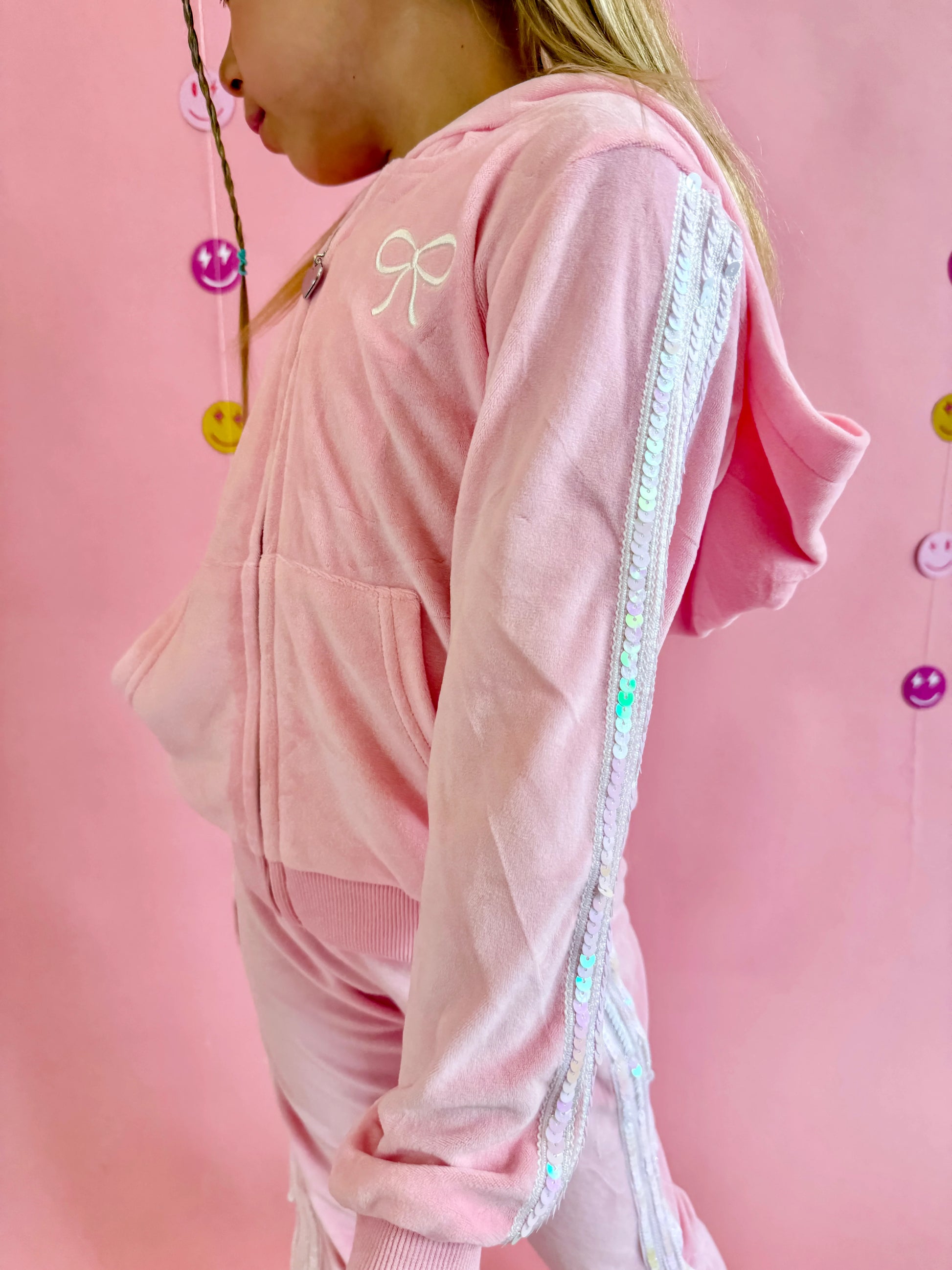 Stay stylish and cozy in our pink velvet two piece set. The pants and top feature white sequins on the side for a touch of sparkle, while the hoodie is adorned with a cute white embroidered bow. Keep your little one warm and fashionable all season long 🩷