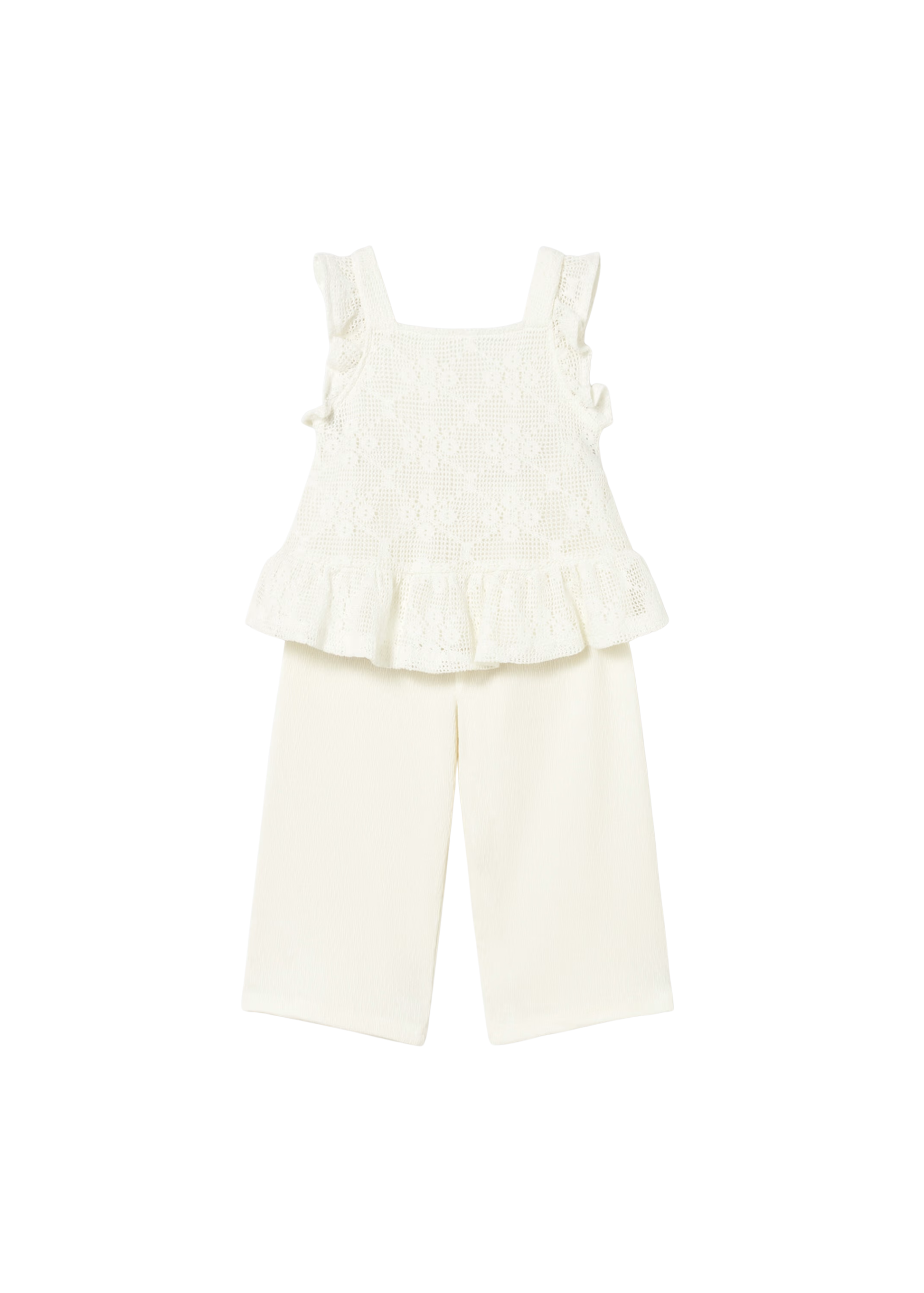 The delicate lace peplum top features wide straps, subtle ruffle details, and a flouncy hem that adds the sweetest touch of movement. Paired with coordinating wide-leg pants in a soft, structured knit, this set blends comfort with polished style.