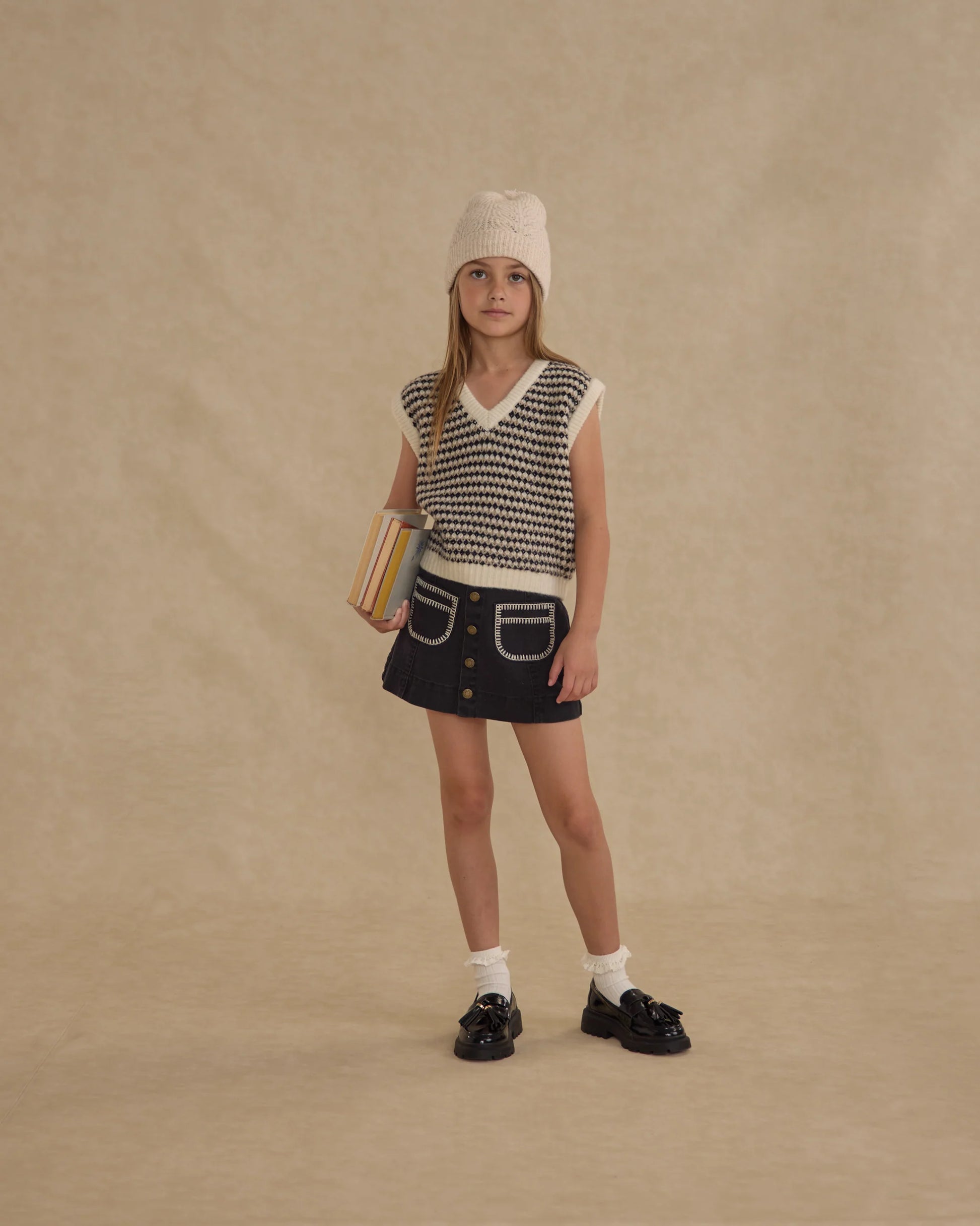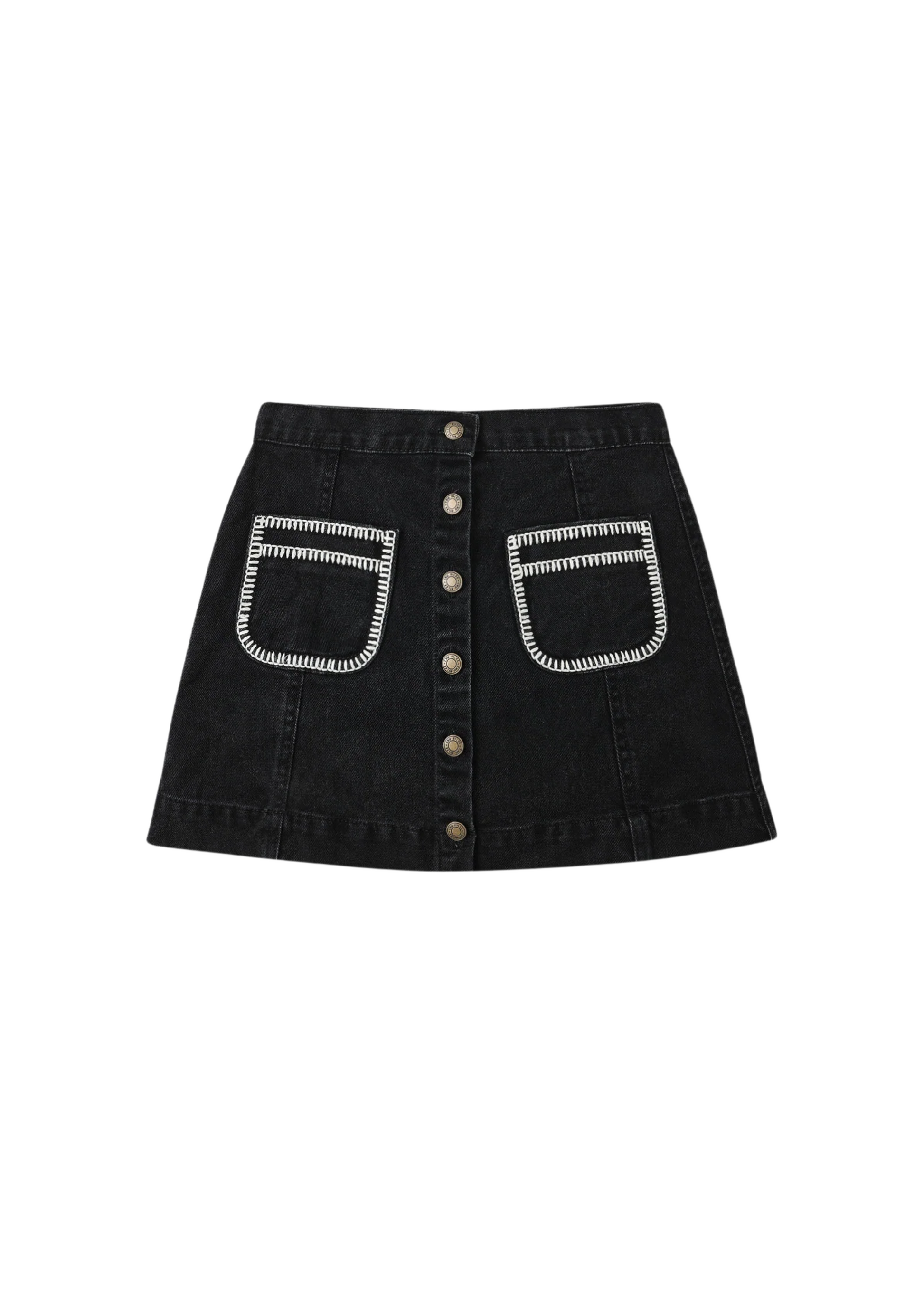 This versatile denim skirt channels preppy charm with antique brass buttons and front patch pockets accented by contrast embroidered stitching.