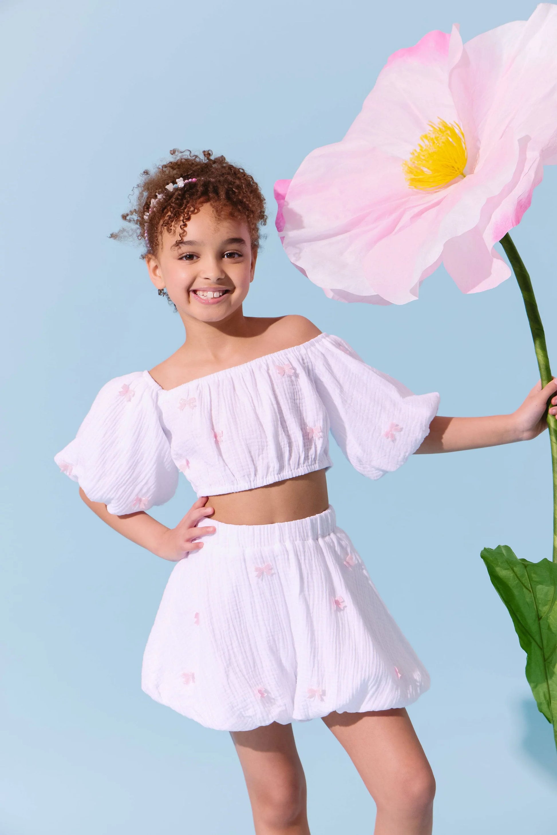 - Bold off-shoulder design with voluminous sleeves brings an elegant flair to this playful set.