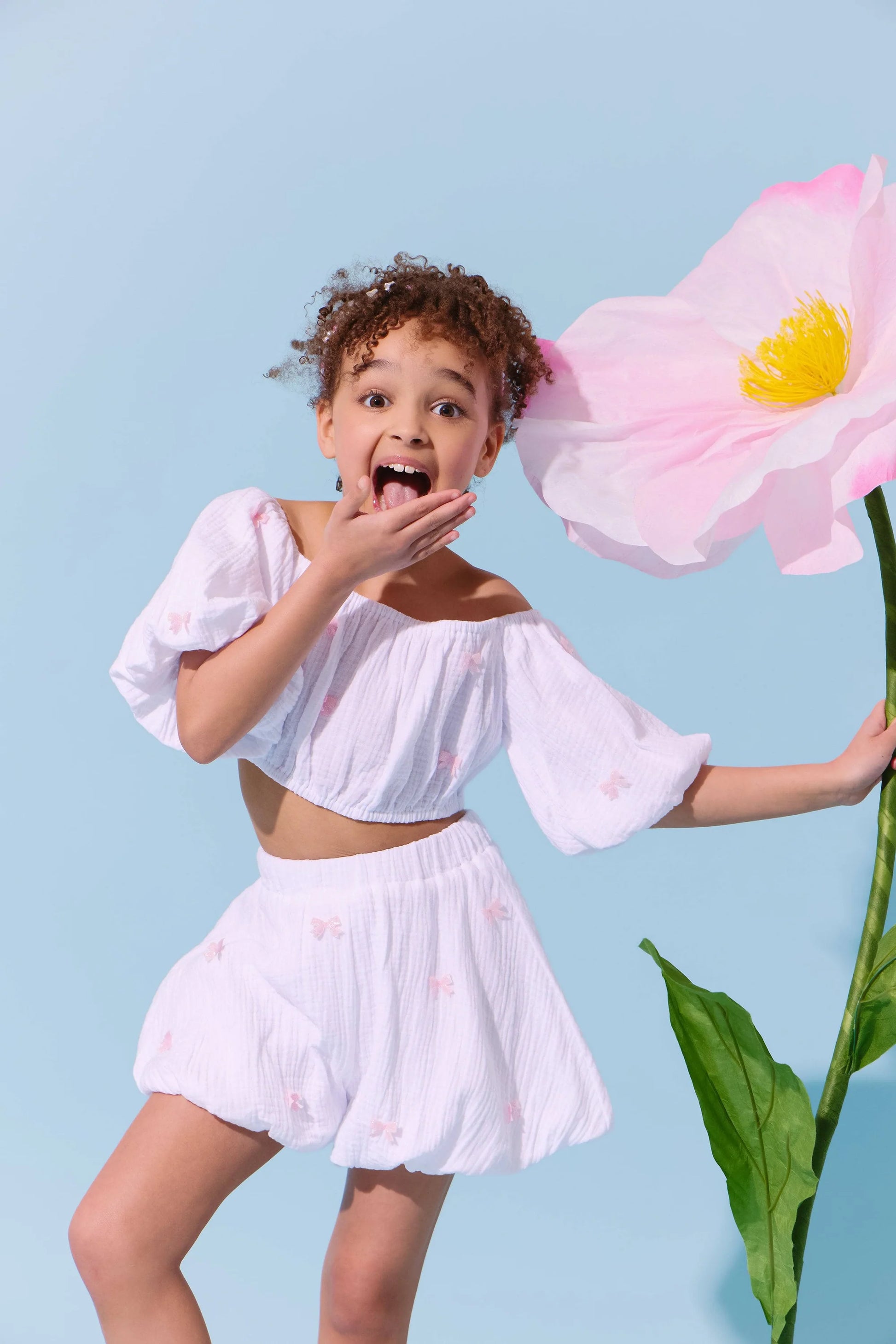 - Exquisite embroidered bows on luxurious, airy muslin fabric for a chic, standout style.