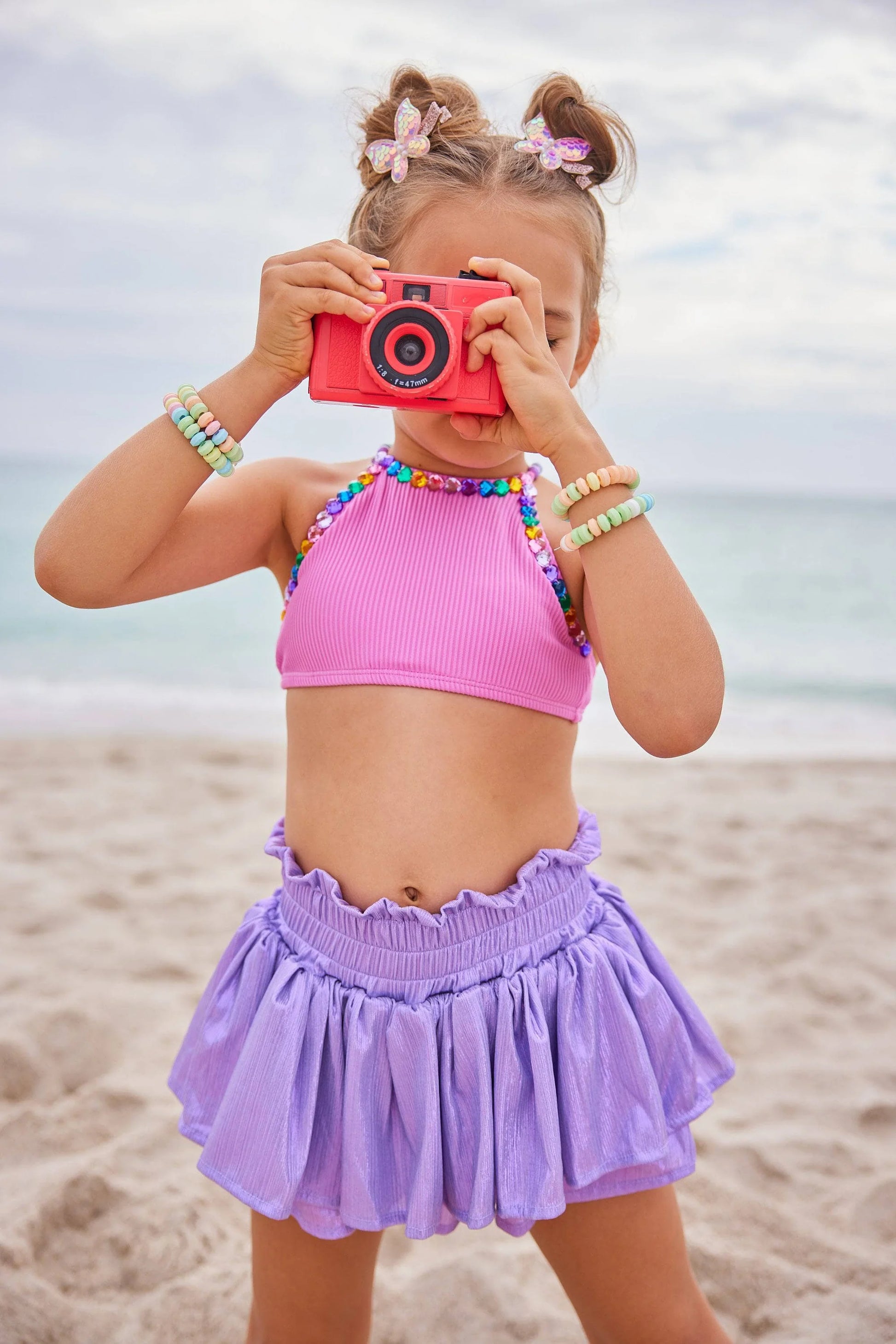 - Eye-catching lavender skirt with a metallic finish for a bold and stylish look.