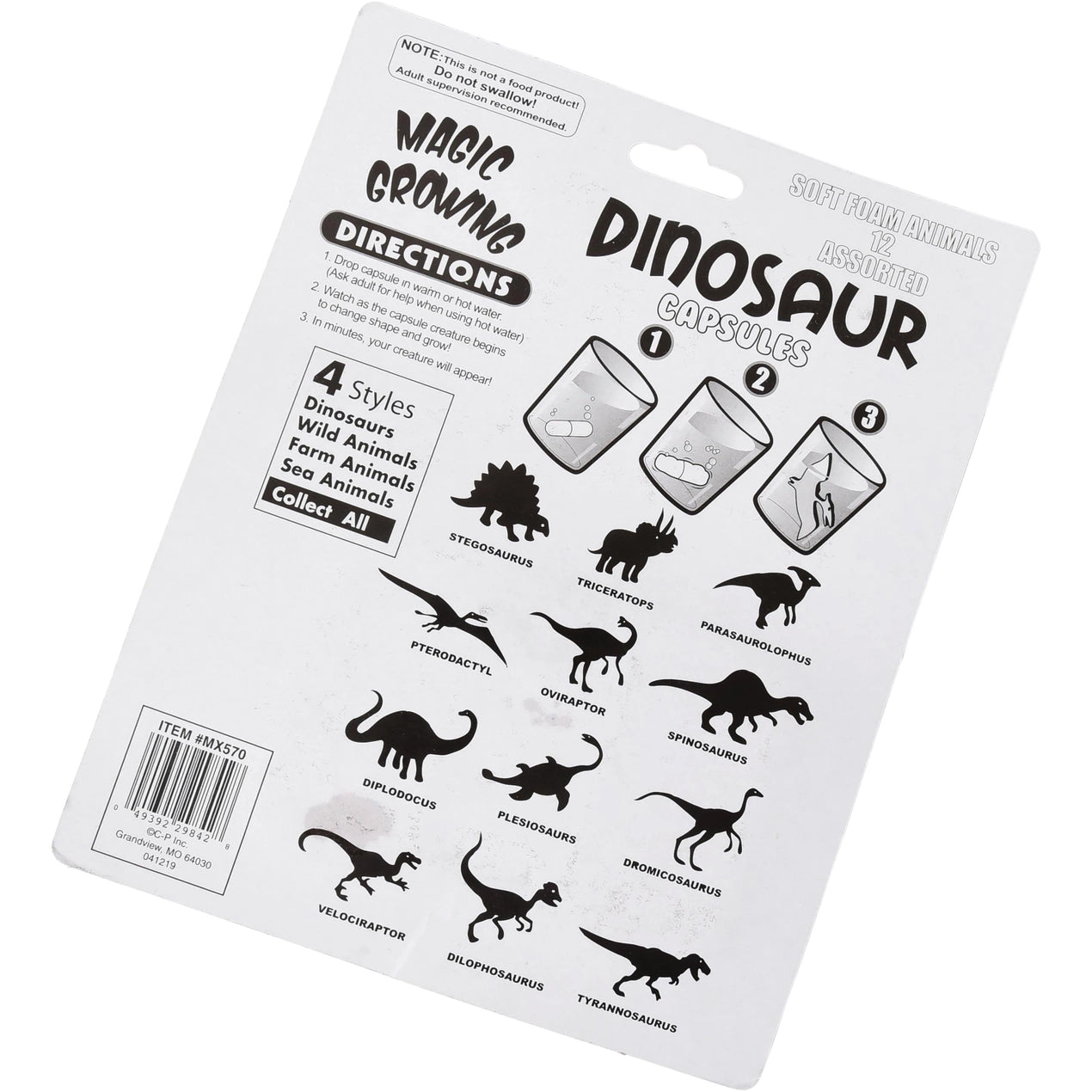 Drop these capsules in warm water and wait for the dinosaur to appear Made of foam Item Capsules expand 600%. .75" L. Capsule Package 12 pieces with assorted styles, 12 packages per unit Age 3+