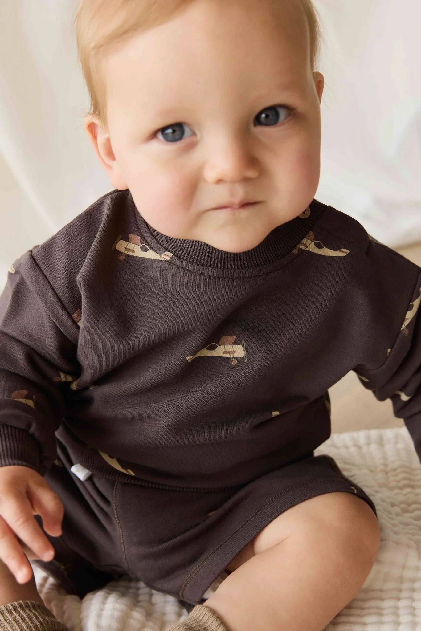 The Peyton Sweatshirt in Pilot Planes Bistre brings playful charm to everyday comfort. This brown sweatshirt features a whimsical aeroplane print and is crafted from a premium blend of 95% Organic Cotton and 5% Elastane, offering both softness and stretch for active little ones.