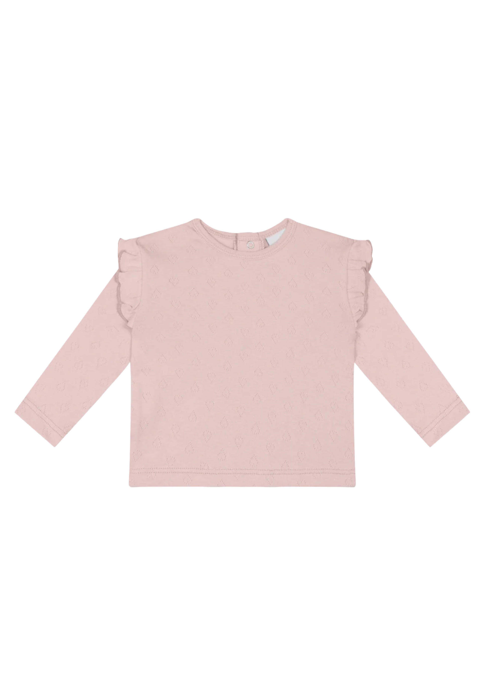 Frill sleeve tshirt with long sleeves has poppers on the back easy changing.