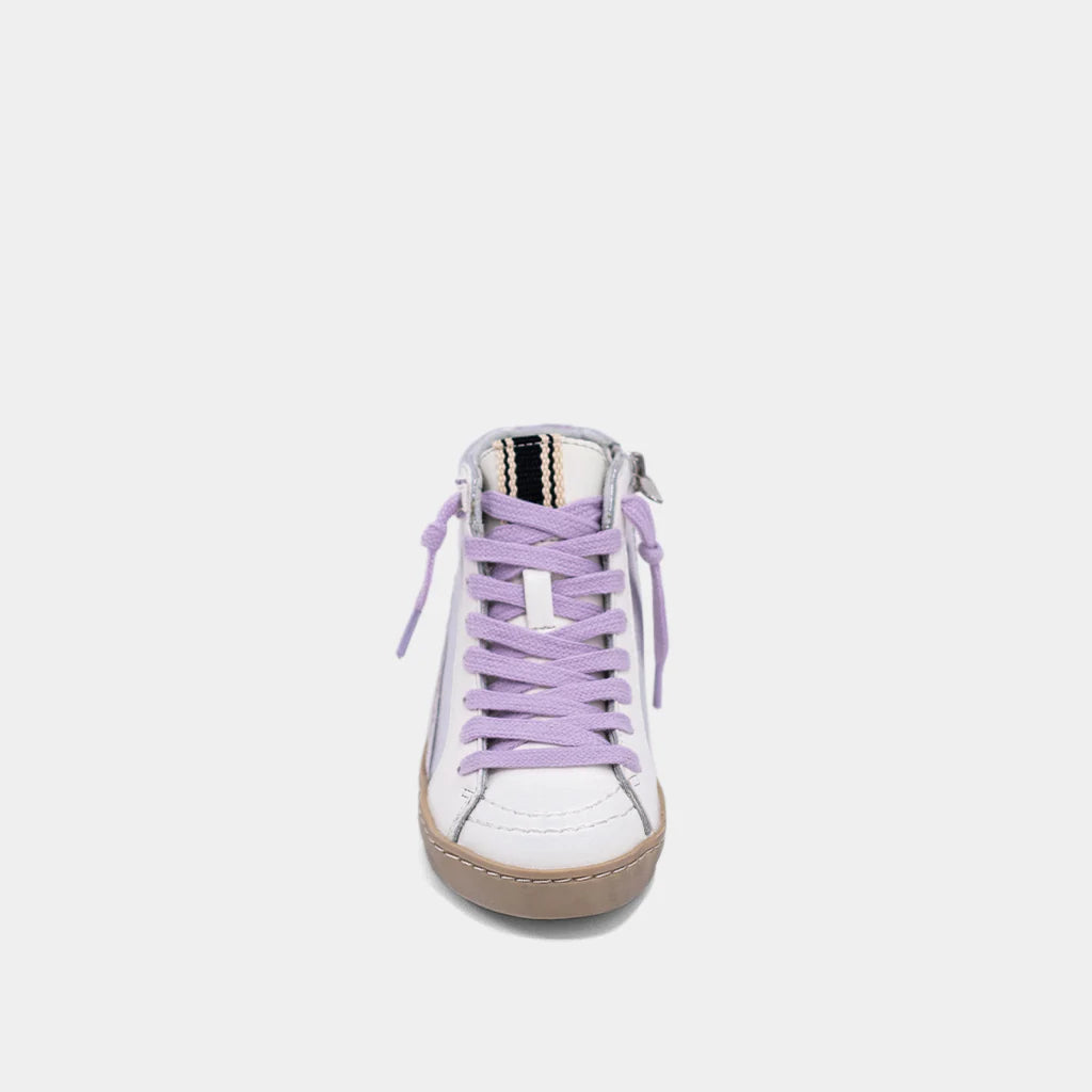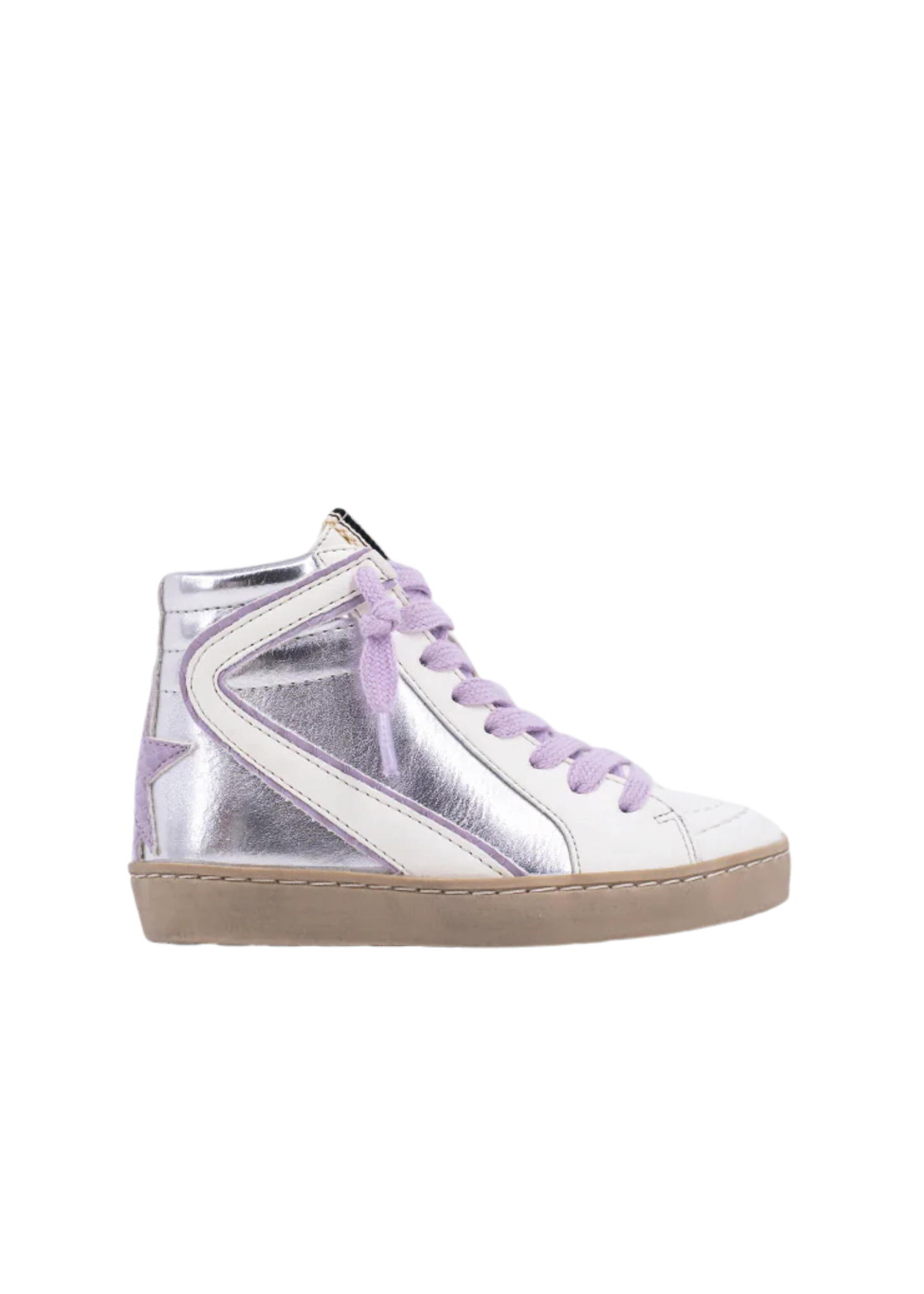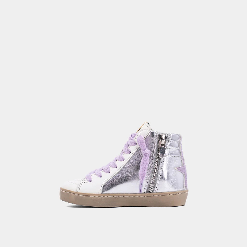 Step up your little one's style with the ROONEY MINI high-tops in Lilac Snake! The metallic silver faux leather body is paired with lilac accents for a playful twist. Perfect for both Kids and Toddlers, these sneakers offer comfort with a sturdy sole and rounded toe. Toddlers' sizes feature a zipper for easy slip-on wear, making them both stylish and practical!