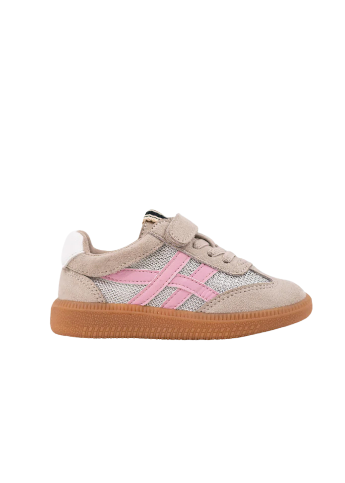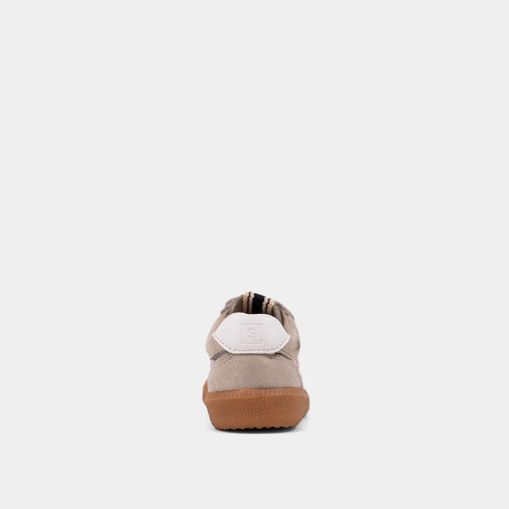 The SASHA MINI in Pink combines style and practicality for kids and toddlers. Featuring soft beige suede and breathable mesh, it's highlighted by vibrant pink faux-leather stripes that add a playful pop of color. The durable gum rubber sole ensures comfort and grip for active days, while toddler sizes include velcro closures for easy wear. Finished with light gray laces and the signature "S" metallic tag, this sneaker is also part of our "Mommy & Me" collection; perfect for stepping out in coordinated style with mom!