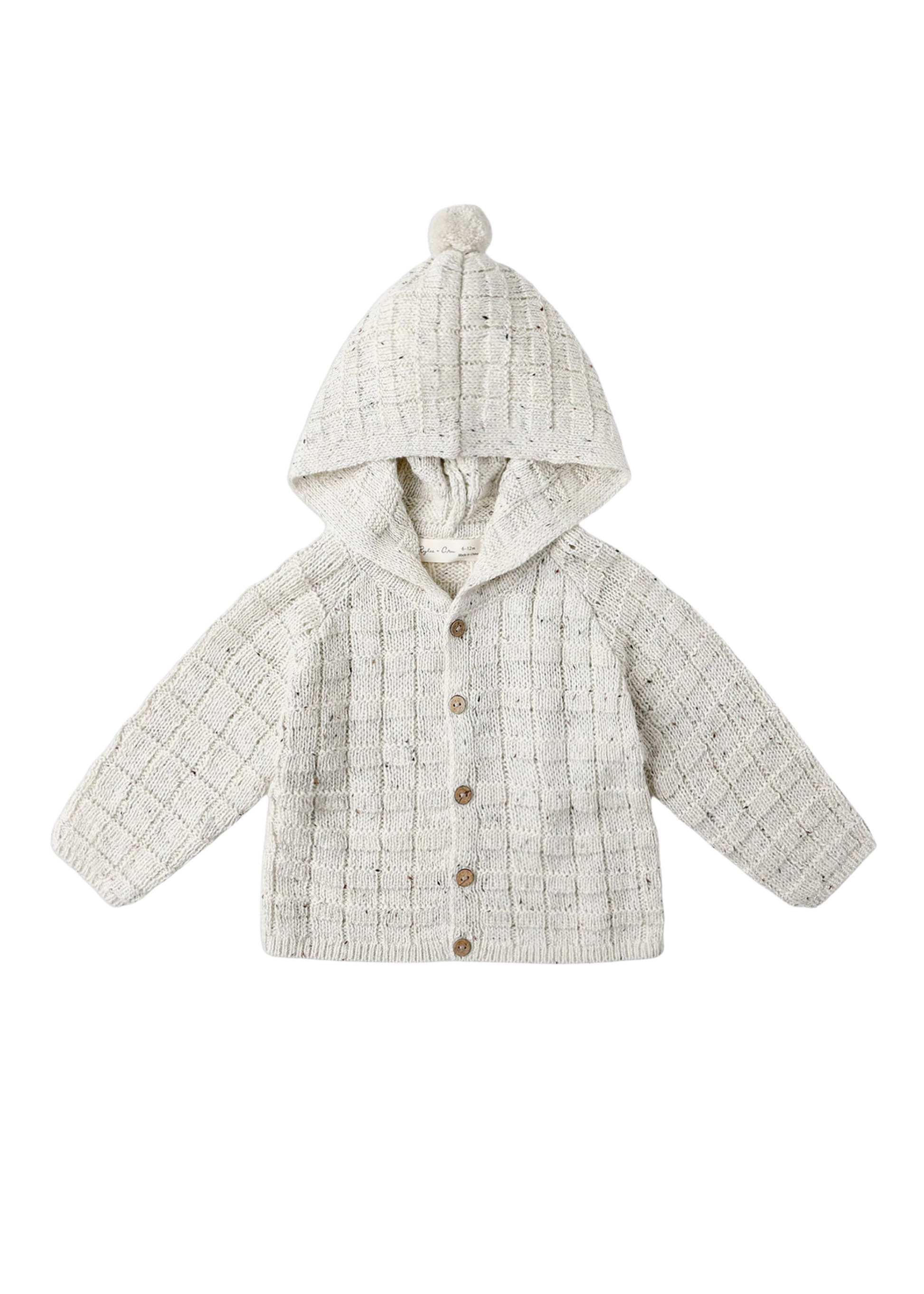 With its checker sweater knit, wooden button closure, and a cozy hood finished with a playful pom pom, this cardigan is perfect for chilly days.