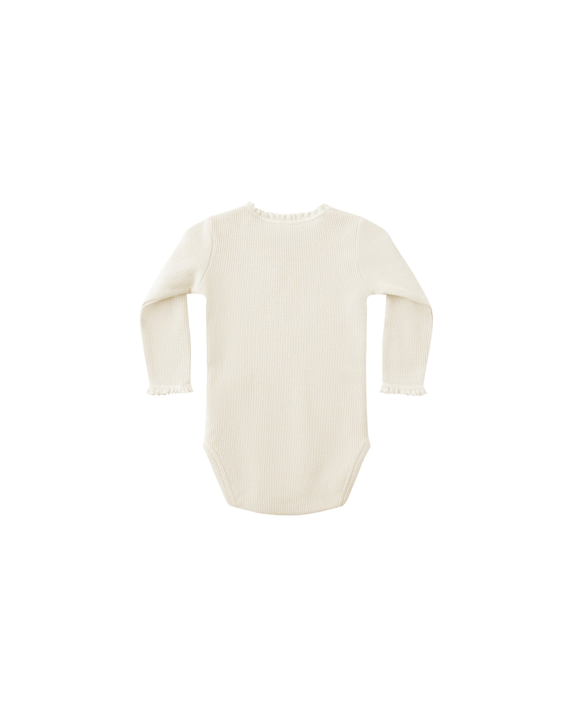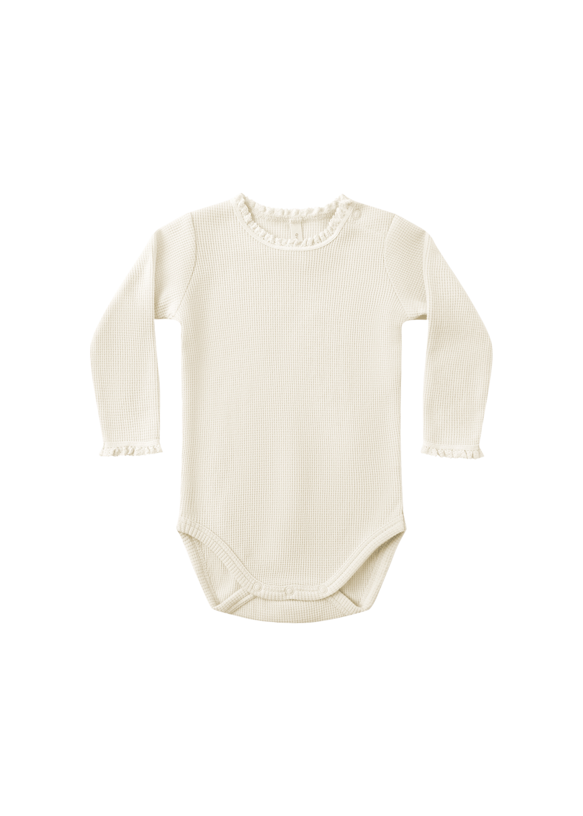 Waffle Long Sleeve Bodysuit with Lace Eyelet Trim.