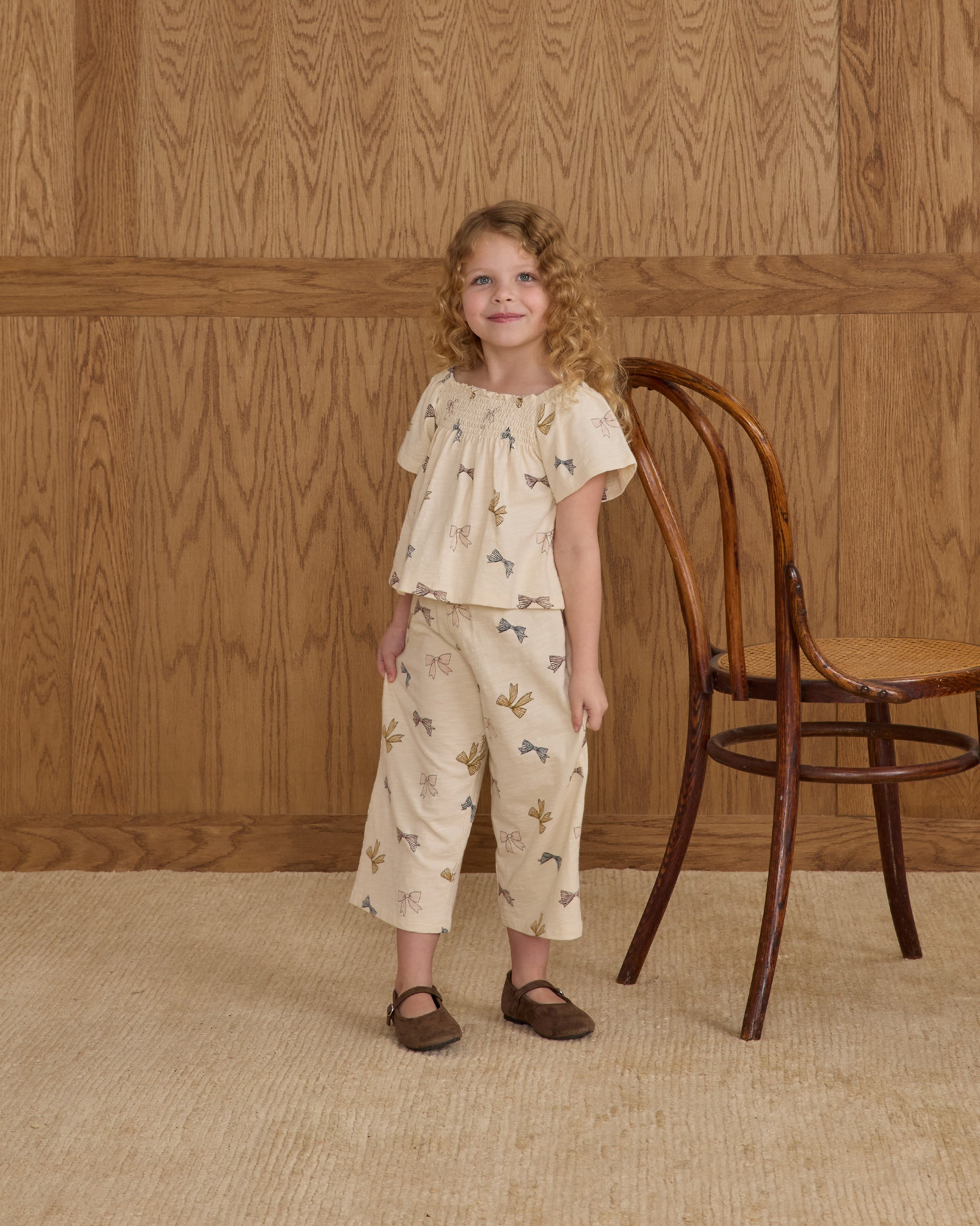 These wide-leg pants for girls combine comfort and style with a soft 100% cotton fabric and an elastic waistband for easy wear. Featuring charming kate bows, they add a delicate, playful touch to any outfit while allowing freedom of movement for active kids. Ideal for everyday wear, these pants balance practicality with a refined look.